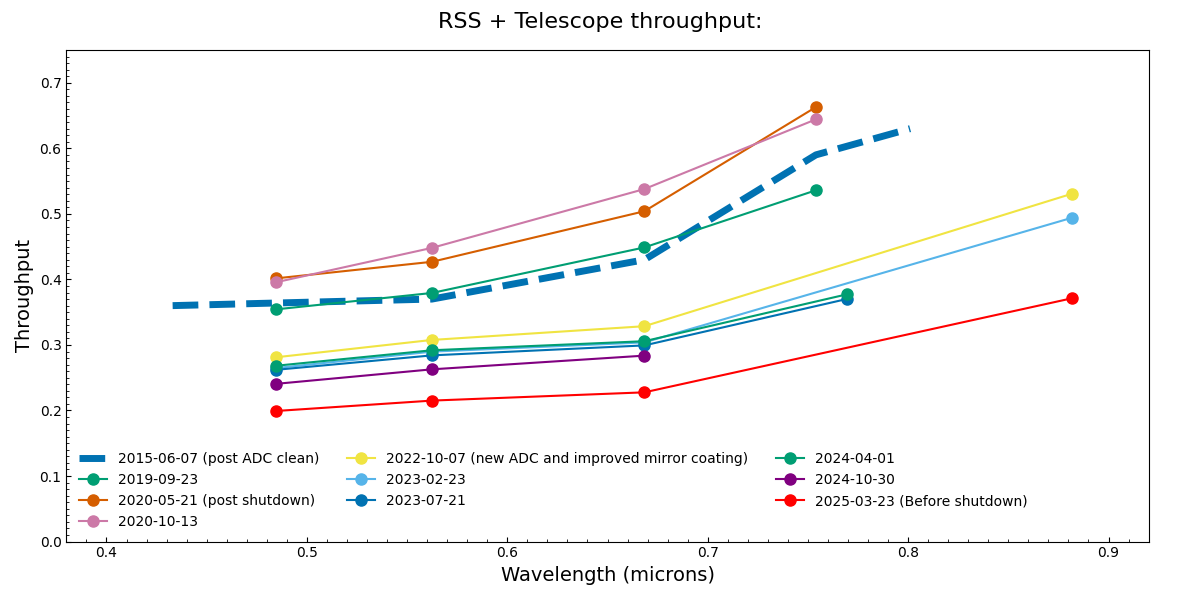 SALT has an active mirror alignment system with edge sensors which keeps its image quality stable during the night. RSS optics are cleaned every 18–24 months; the most recent service was performed in April 2025 (see Sec. 4.3 for the effects of servicing on the throughput measurements).