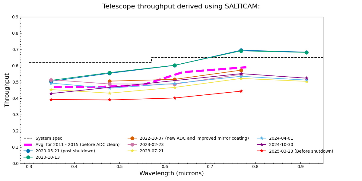 A strategic restoration project (ReSAC) is being developed to fully recover and enhance SALT’s performance. In the interim, proposers are encouraged to factor in the reduced throughput when planning observations. The SALT instrument simulators have been updated to reflect the current throughput and will continue to be maintained accordingly.